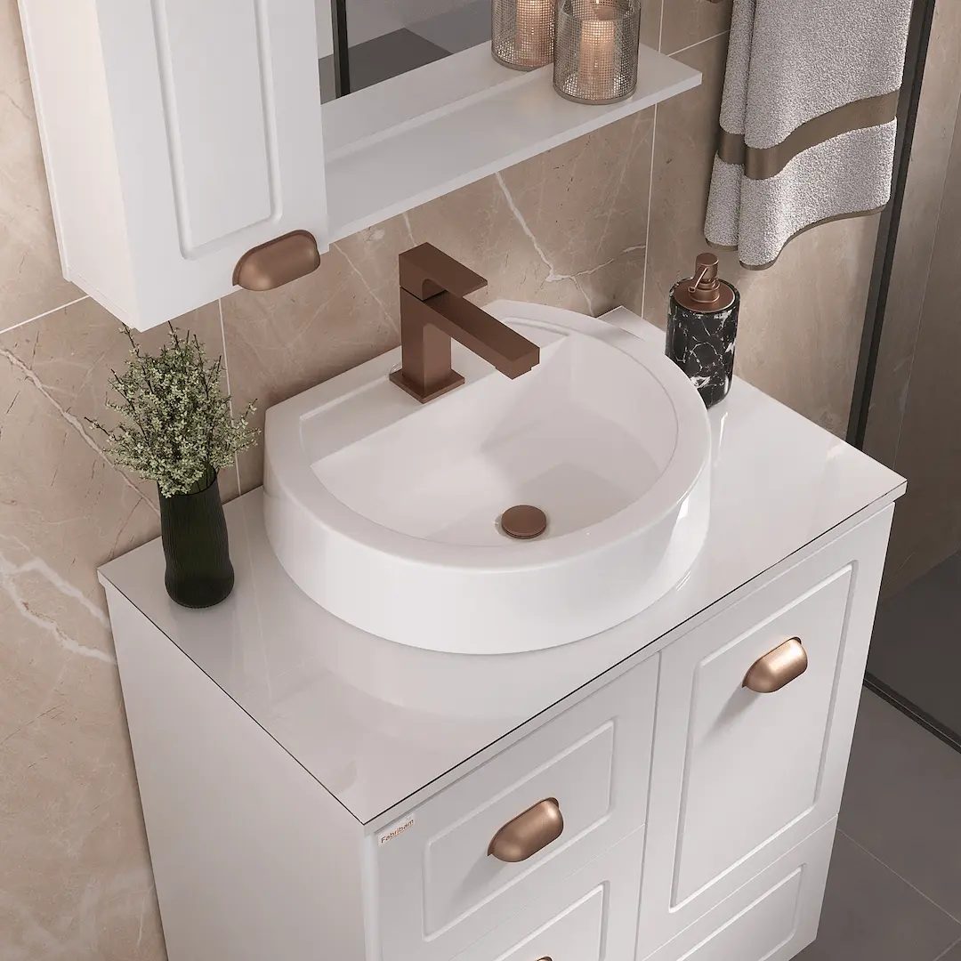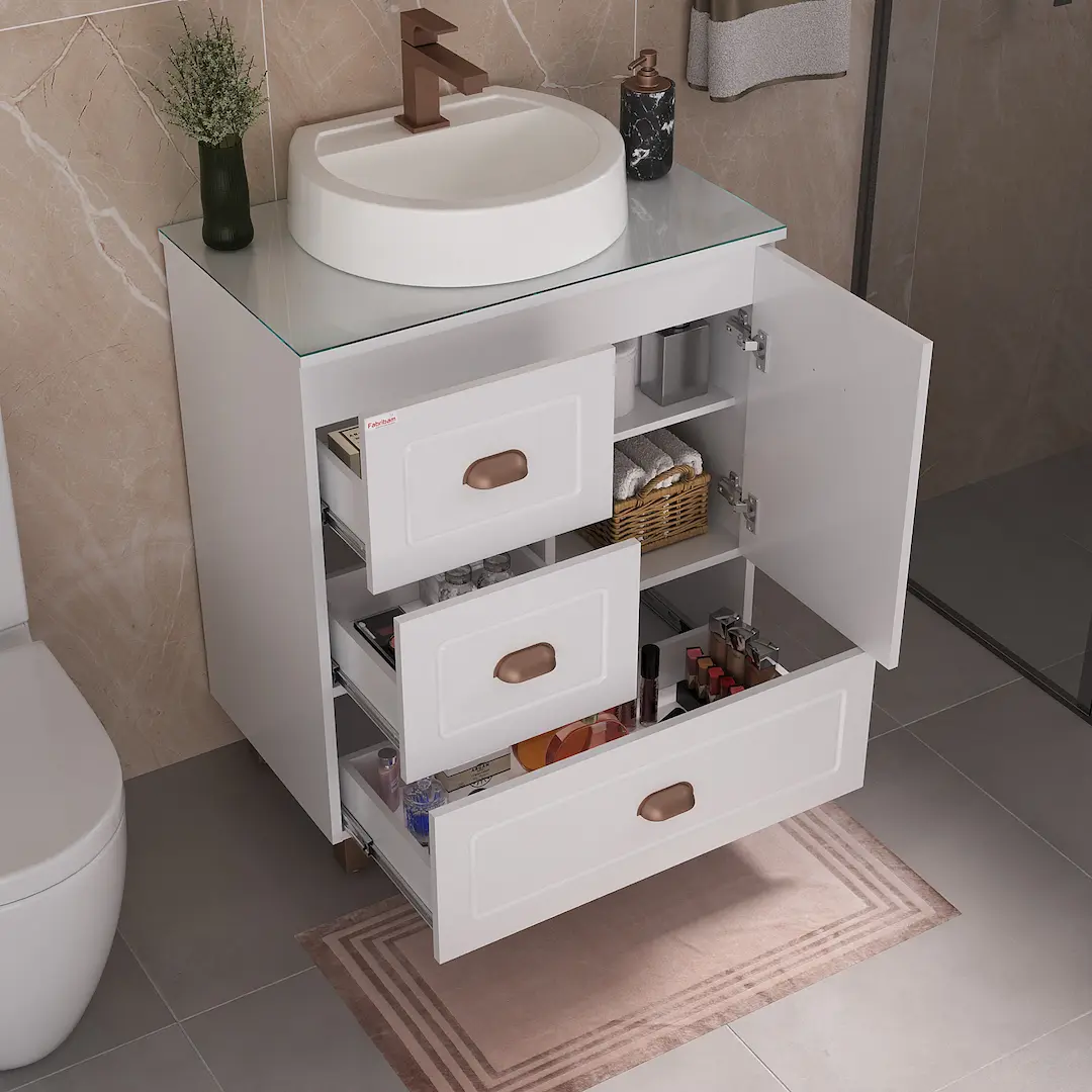 O Conjunto Catarina é a definição de sofisticação. Todo em branco, seu design se destaca pelos detalhes fresados nas portas e gavetas, que remetem ao estilo almofadado, trazendo charme e elegância ao ambiente. Os puxadores em cobre fosco adicionam um toque vintage, enquanto as portas com amortecimento e as gavetas de deslize suave garantem mais conforto no uso diário. Para maior durabilidade, o gabinete conta com uma bancada de MDF e tampo de vidro, protegendo o móvel com praticidade e refinamento.
