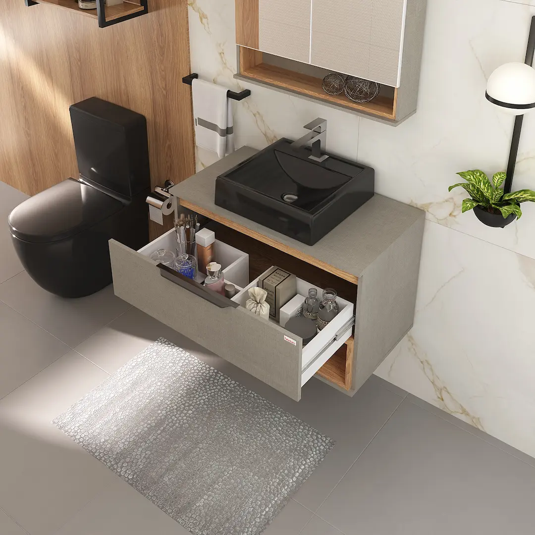 O Conjunto Isadora é a escolha perfeita para um banheiro moderno e sofisticado. O gabinete suspenso conta com uma gaveta ampla de deslize suave e um nicho aberto, ideal para organizar itens do dia a dia. A espelheira com portas espelhadas e nicho integrado complementa o conjunto, proporcionando mais praticidade e estilo ao ambiente.