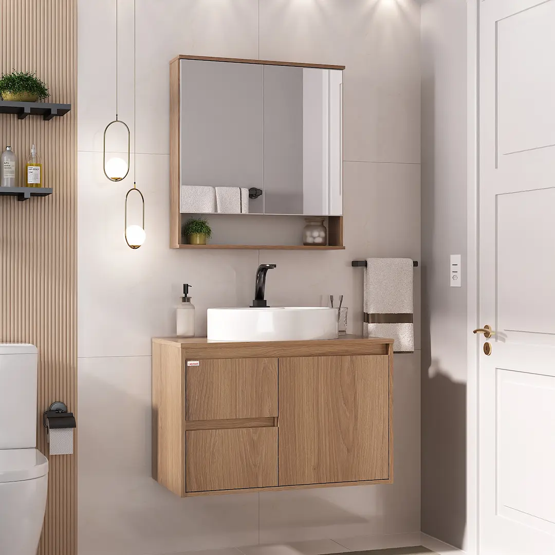O Conjunto Nicole tem acabamento laminado, resistente à umidade e arranhões. O móvel possui duas gavetas com deslize suave e abertura total, oferecendo praticidade para organizar seus itens de forma acessível e funcional. Unindo sofisticação e funcionalidade, é a escolha perfeita para quem busca beleza e praticidade no banheiro.