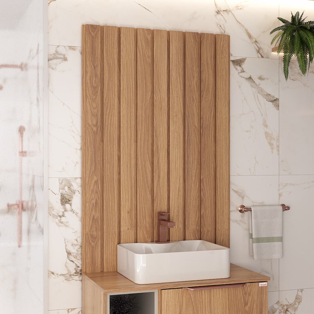O Painel Ripado é uma excelente alternativa para aqueles que desejam trazer ainda mais sofisticação e funcionalidade ao espaço do banheiro ou lavabo. Combinado com a sobreposição de um espelho torna-se um elemento charmoso na decoração, sua estrutura simples e orgânica traz, ao mesmo tempo, um toque sofisticado ao banheiro.