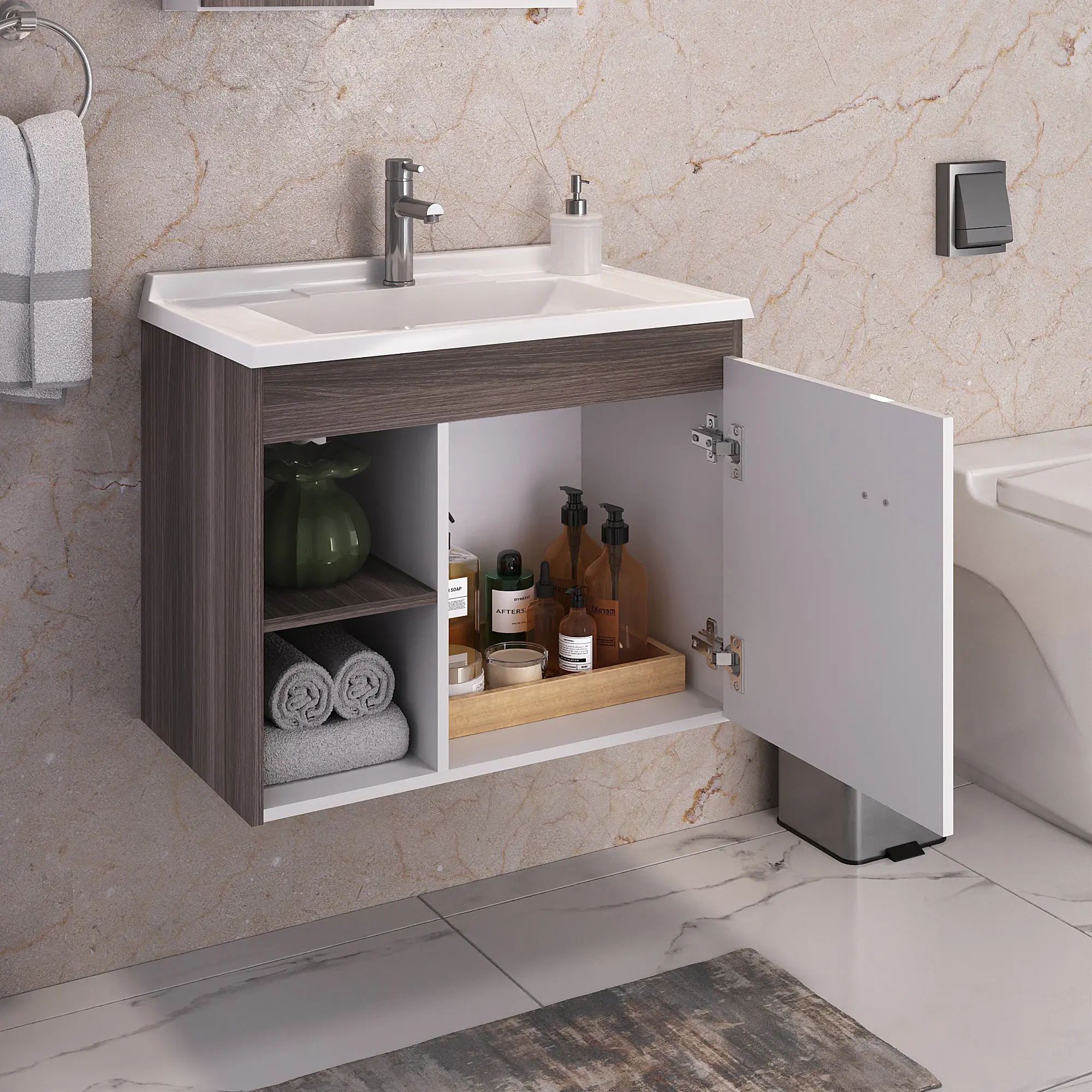 O Kit Sophia possui um gabinete em estrutura amadeirada, com porta ampla e nichos laterais, ideais para organizar e decorar o ambiente. Inclui o lavatório Soft em mármore sintético com capacidade de 6 litros, além de uma espelheira com espelho amplo e porta lateral com prateleira interna para itens menores. Um conjunto que combina organização e praticidade, atendendo às necessidades de toda a família.