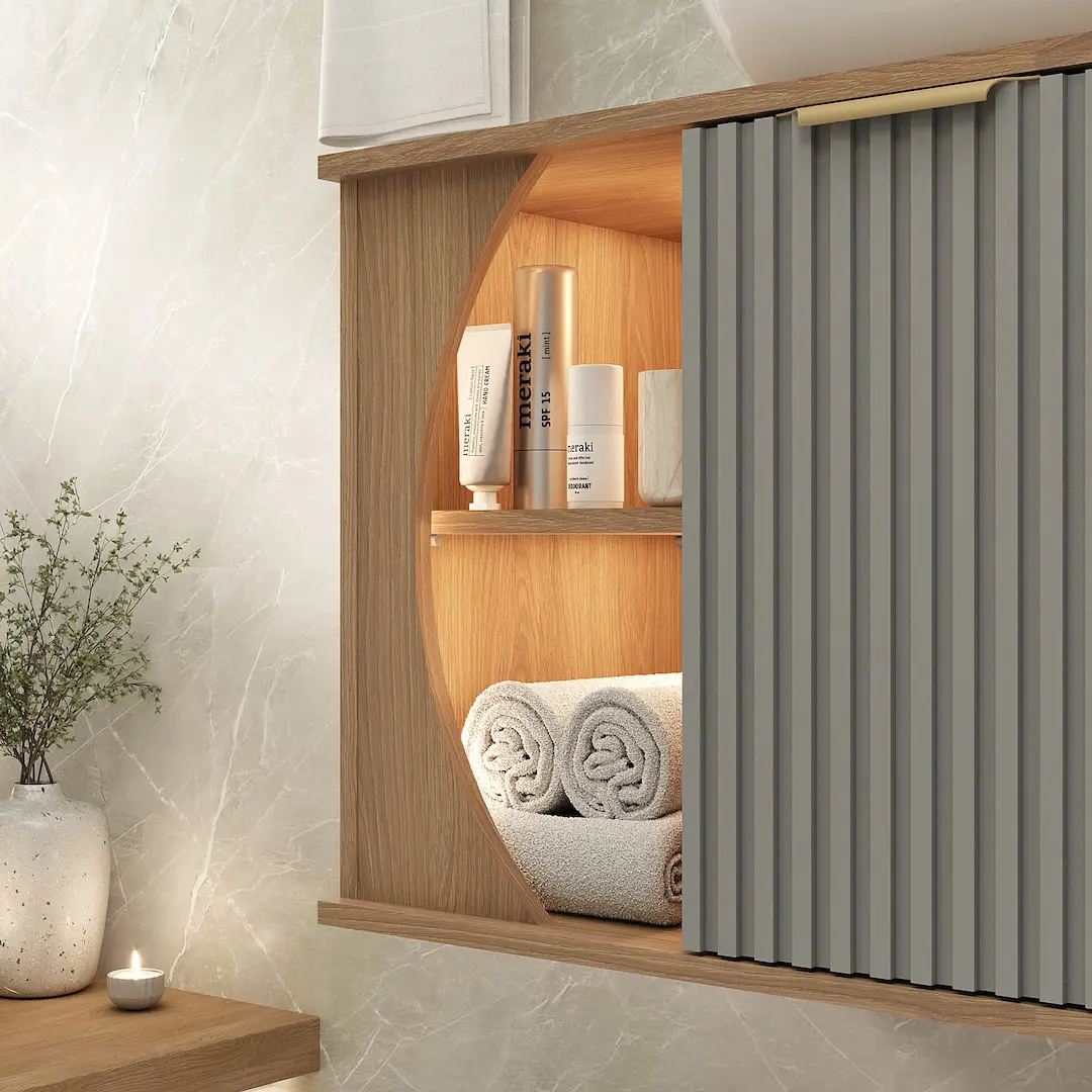O Conjunto Tereza Cristina combina sofisticação e funcionalidade em um design moderno e elegante. O gabinete, com canto arredondado e nicho lateral iluminado, valoriza a decoração do ambiente e traz um toque refinado. Seu acabamento laminado é resistente à umidade e arranhões, enquanto a frente ripada revestida em PVC garante ainda mais durabilidade. A espelheira segue o mesmo conceito de design, com cantos arredondados que suavizam o visual e trazem um toque contemporâneo. Suas portas espelhadas ampliam o espaço e oferecem funcionalidade, enquanto os compartimentos internos garantem organização de forma discreta e elegante.